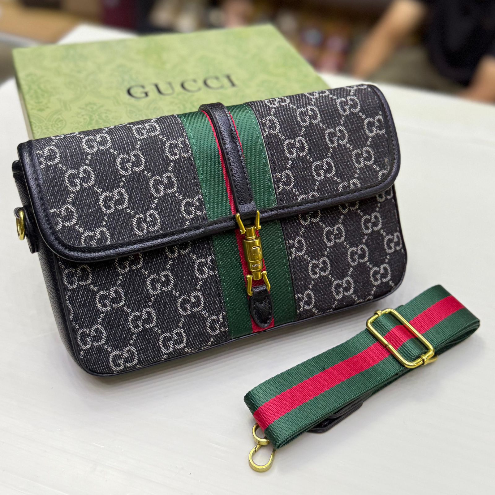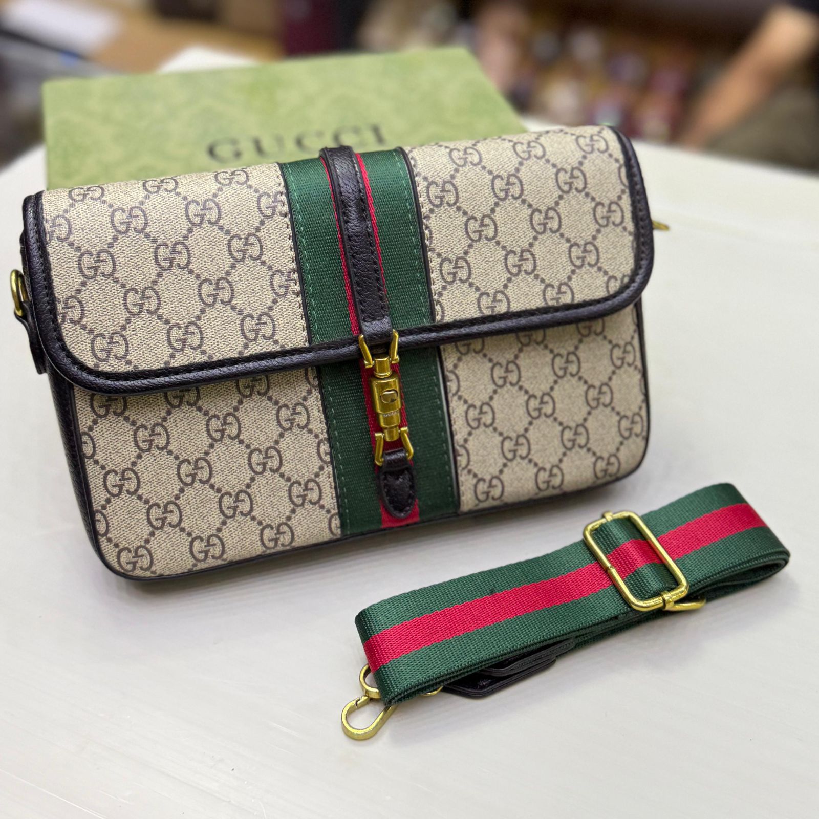 Exterior often includes brand-signature details such as the interlocking Double G hardware, green-and-red Web stripe or embossed Gucci logo.
