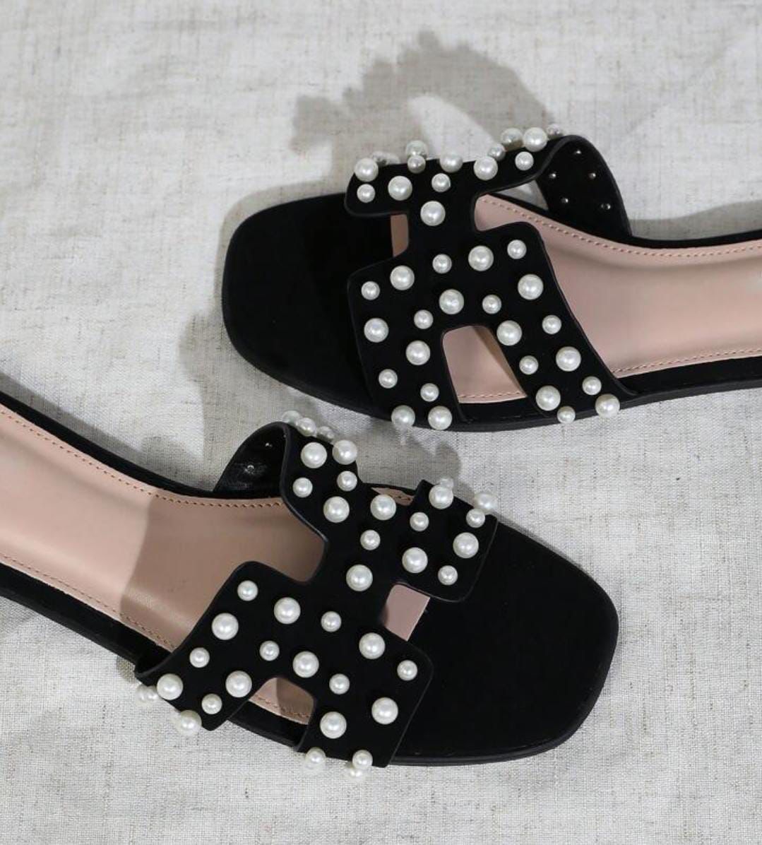Pearl‑accented open‑toe slide sandals with sleek, minimal flair—ideal for elevating casual and dressy looks.