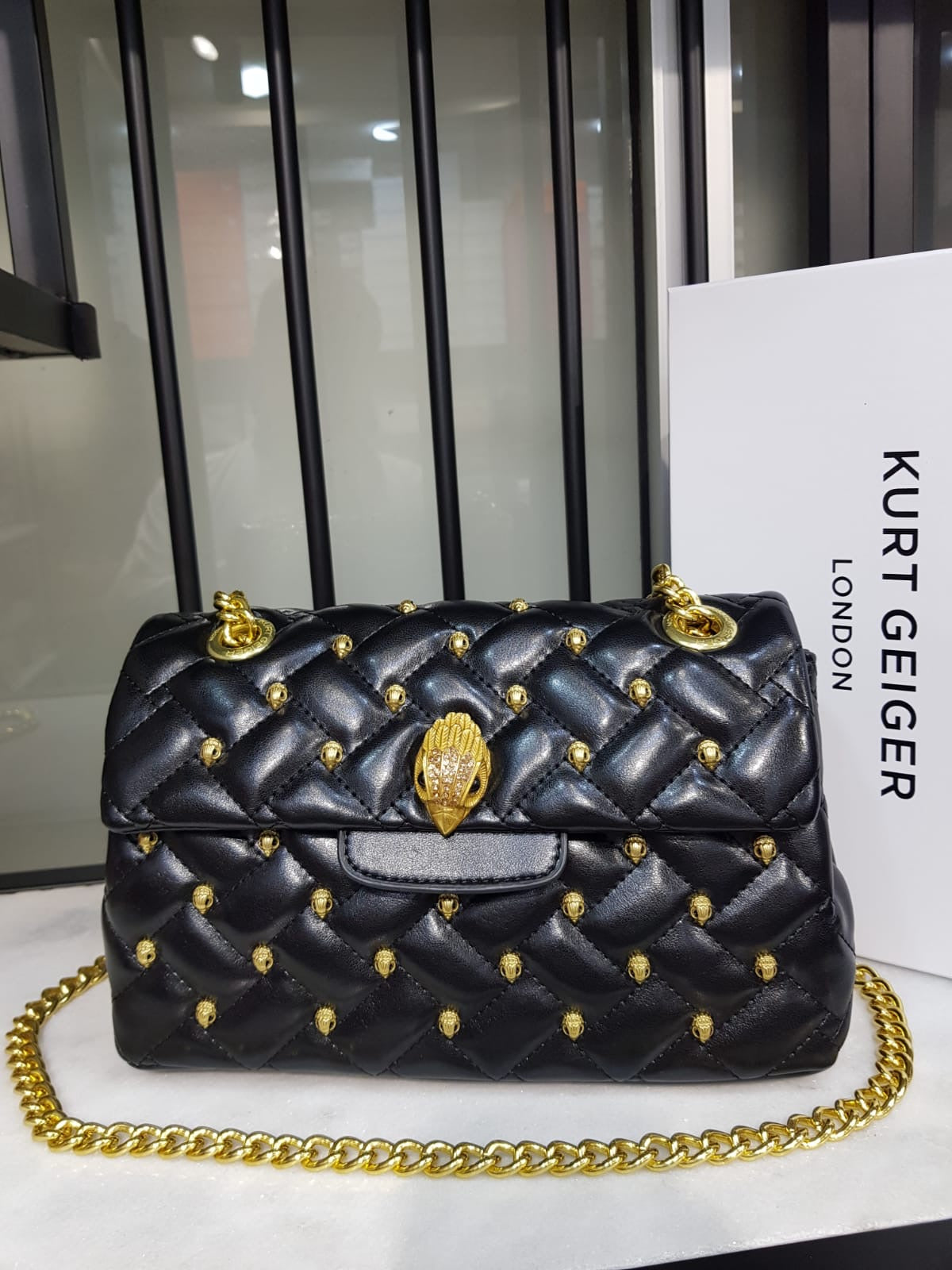 - Dimensions: 27 x 16 x 9 cm - Signature parquet padded overstitch quilt - Eagle head on the front flap - Metal chain strap - Duo magnetic snap closure - Logo on the back - Gold finish hardware - Internal zip pocket & slip pocket - Box & Dust bag included